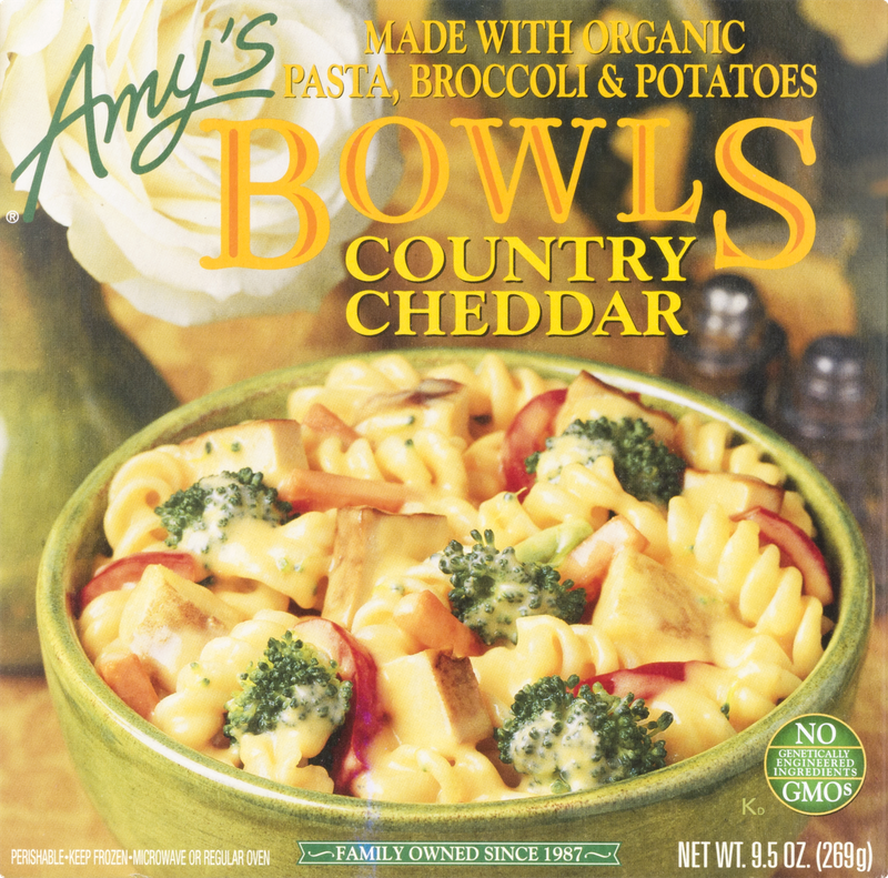 Amy's® Bowls Country Cheddar. Made with organic pasta, broccoli & potatoes. We use only the finest ingredients and prepare them with the same careful attention in our kitchen as you would in your own home. This bowl is a delightful combination of tender organic broccoli, julienne carrots, roasted potatoes, red bell peppers and baked tofu with rotini pasta. All dairy ingredients are made with pasteurized, rBST-hormone-free milk. Contains no GMOs, meat, fish, shellfish, poultry, eggs or peanuts.