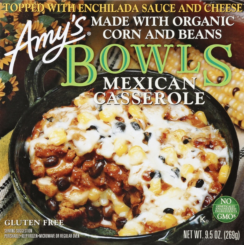 Amy's® Bowls Mexican Casserole Light In Sodium. Made with organic corn and beans. No GMOs - genetically engineered ingredients. This product is Gluten free. We use only the finest natural and organic ingredients. All dairy ingredients are made with pasteurized, rBST hormone-free milk and do not contain animal enzymes or animal rennet.