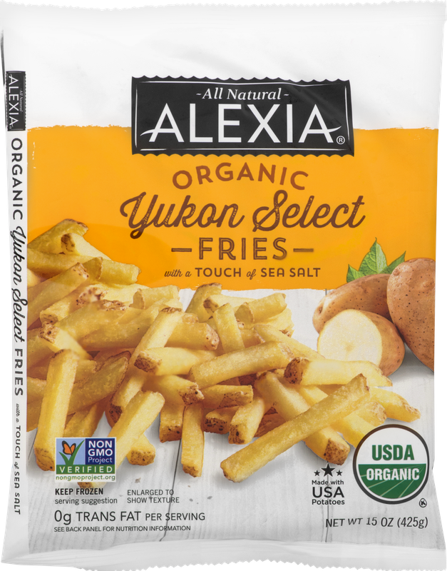 Alexia® Organic Yukon Select Fries With A Touch Of Sea Salt. Yukon select potatoes thinly sliced & lightly seasoned to delicious perfection. This all natural product is made with USA potatoes. Contains no preservatives or artificial flavors. It is a Certified USDA Organic and Non-GMO product.