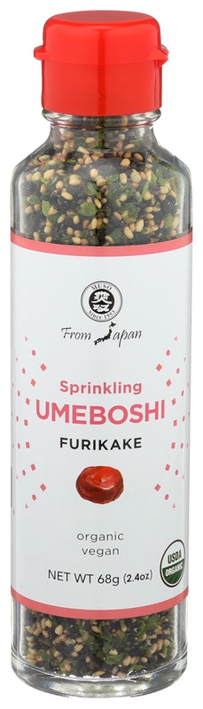 From japan™, organic sprinkling furikake (fooree-ka-keh) is a ready-to-use table condiment made only with plant-based ingredients and free of additives and artificial flavors. Umeboshi furikake is a basic blend of toasted sesame seeds and green nori flakes with dried umeboshi (brined ume plums) and dried brined shiso leaves that bring out unique mixture of acidic and salty flavors. Just sprinkle it on grilled meat or fish, a bowl of rice, or anything else where you want to deliver an extra pop of flavor and satisfying crunch. It can be a topping for noddle dishes and even a salad seasoning. It is a condiment in its own right. Since 1953.