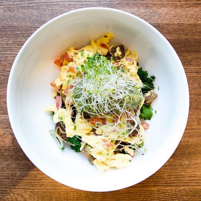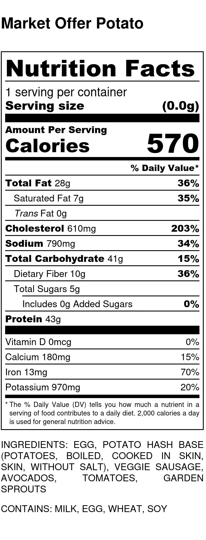 Ingredients: Egg, Potato Hash Base (Potatoes, boiled, cooked in skin, skin, without salt), Veggie Sausage, Avocados, Tomatoes, Garden Sprouts