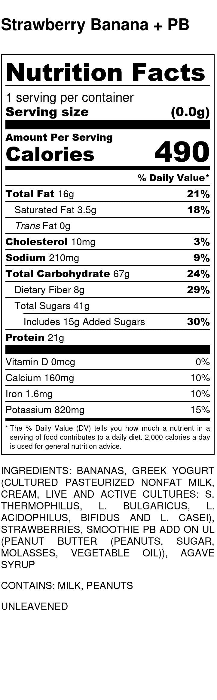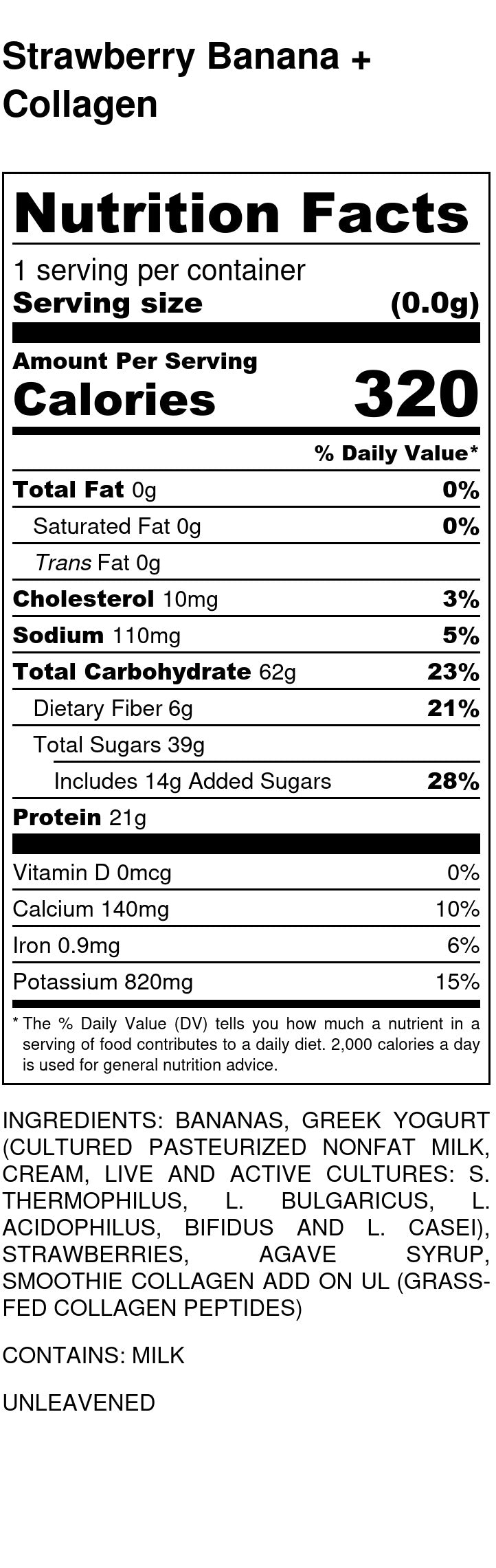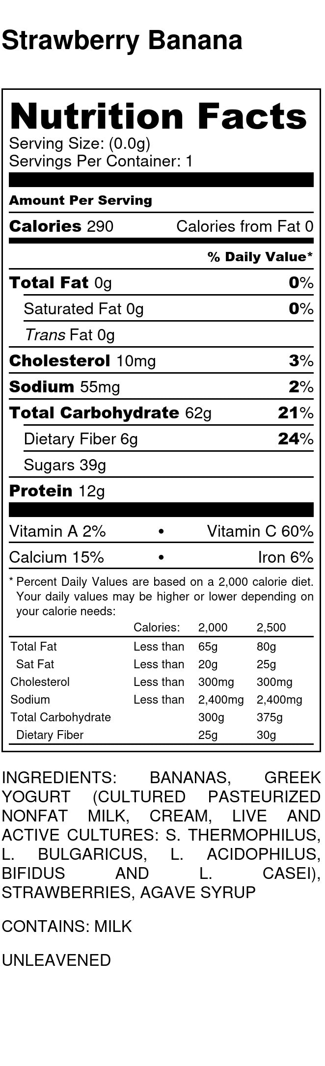 Bananas, Greek Yogurt (Cultured Pasteurized Nonfat Milk, Cream, Live and Active Cultures: S. Thermophilus, L. Bulgaricus, L. Acidophilus, Bifidus and L. Casei), Strawberries, Agave Syrup